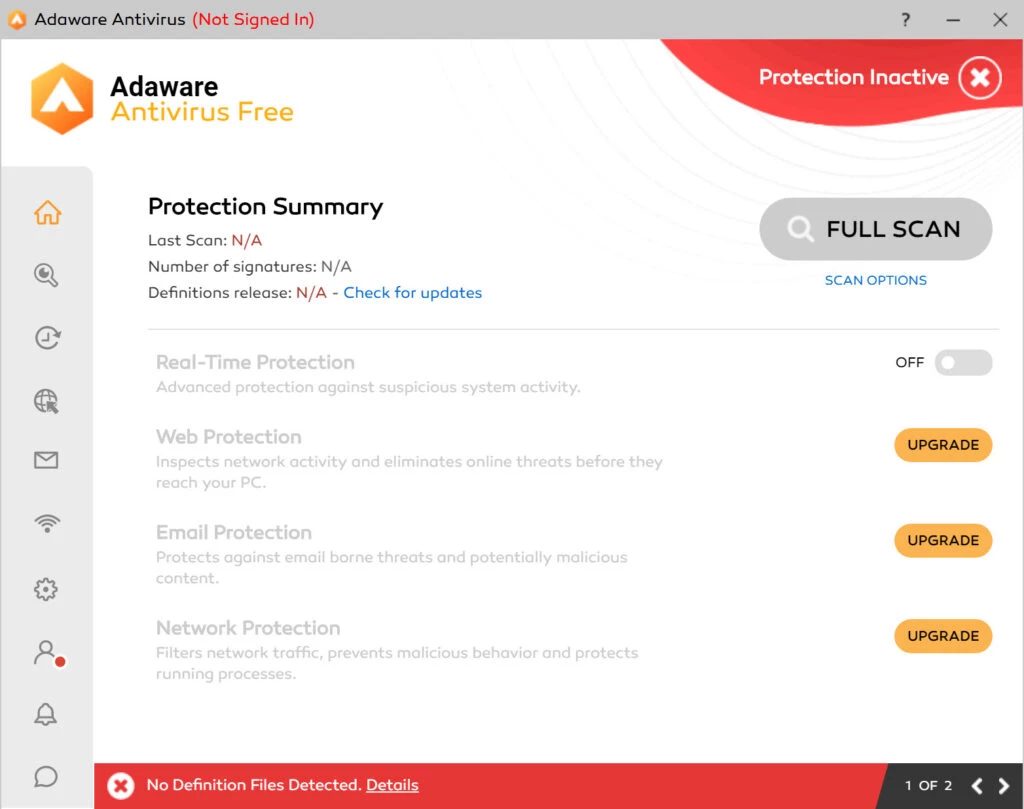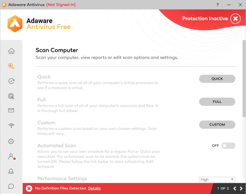 Adaware zapewnia najlepszą integrację z systemami operacyjnymi Windows 10 i Windows 11 oraz udostępnia 3 główne opcje skanowania: Szybkie, Pełne i Niestandardowe.